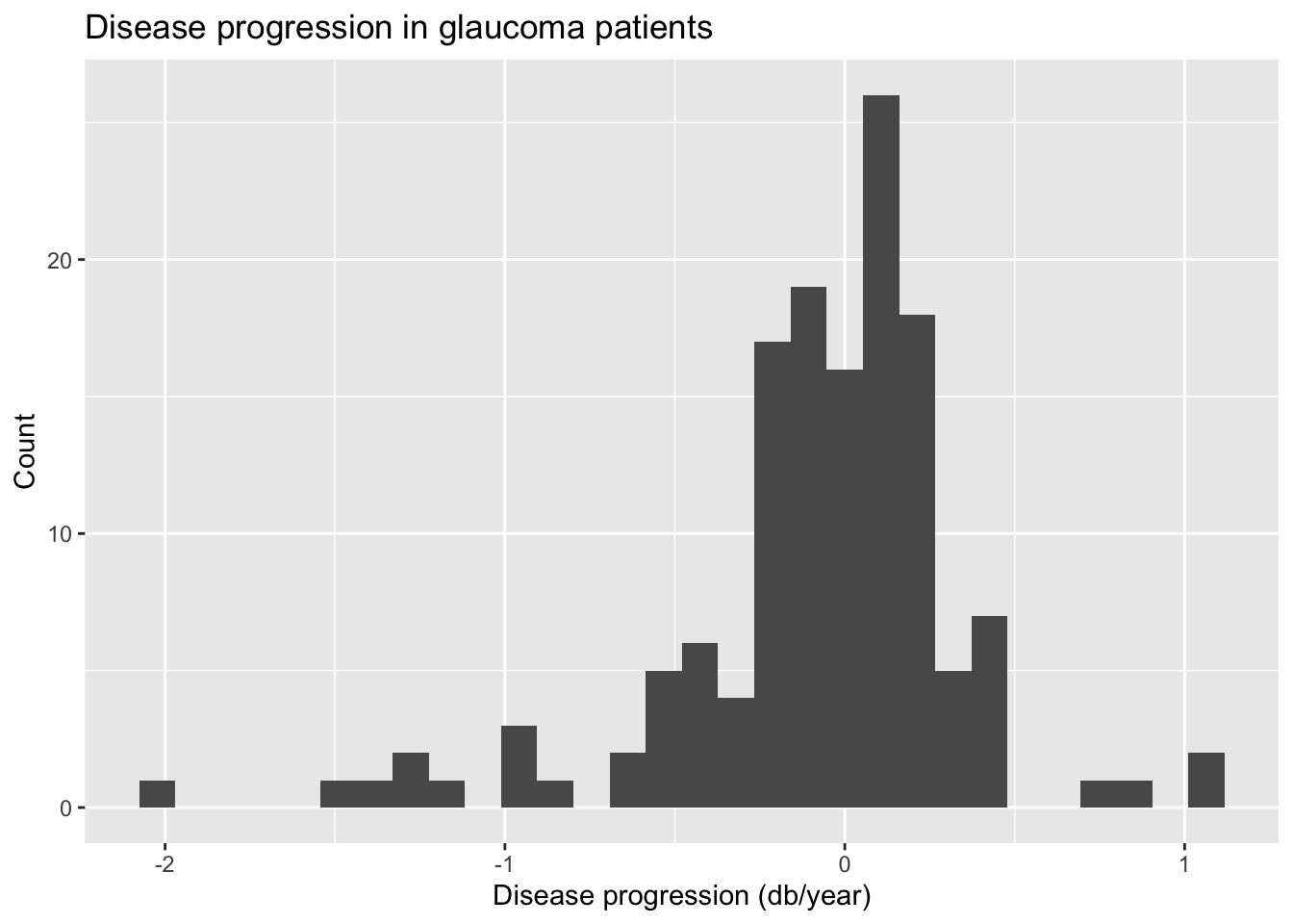 Let’s begin by examining the univariate distributions of the disease progression and IOP. The code to visualize and calculate summary statistics for progression is below.