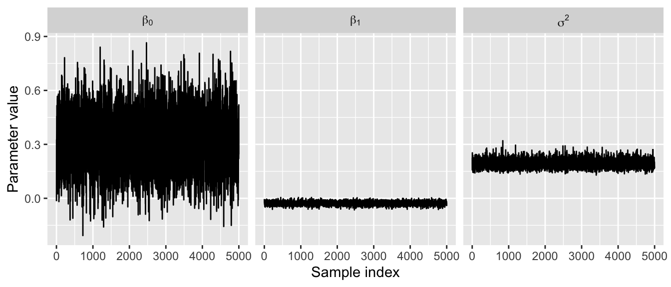 parameter = rep(c("beta[0]", "beta[1]", "sigma^2"), each = S),