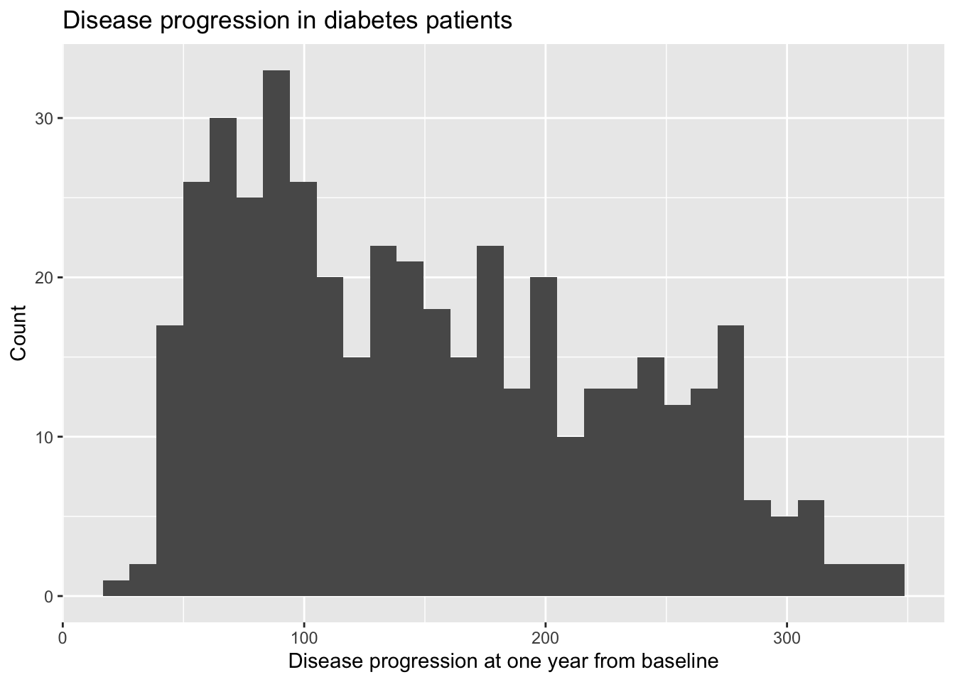 Today we will use data from the paper Least Angle Regression by Efron et al. There are ten baseline variables, age, sex, body mass index, average blood pressure, and six blood serum measurements were obtained for each of n = 442 diabetes patients, as well as the response of interest, a quantitative measure of disease progression one year after baseline.