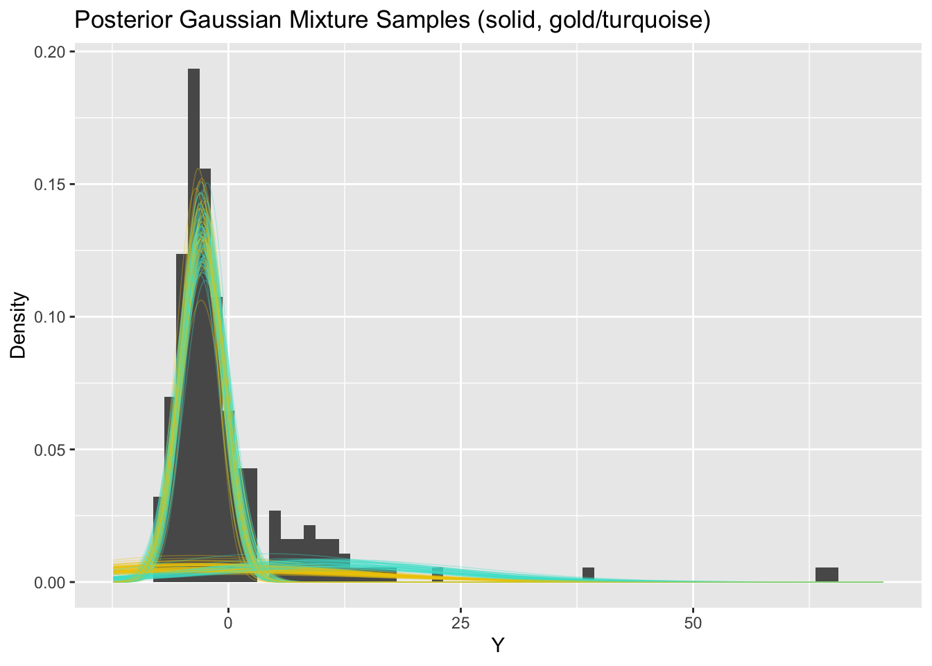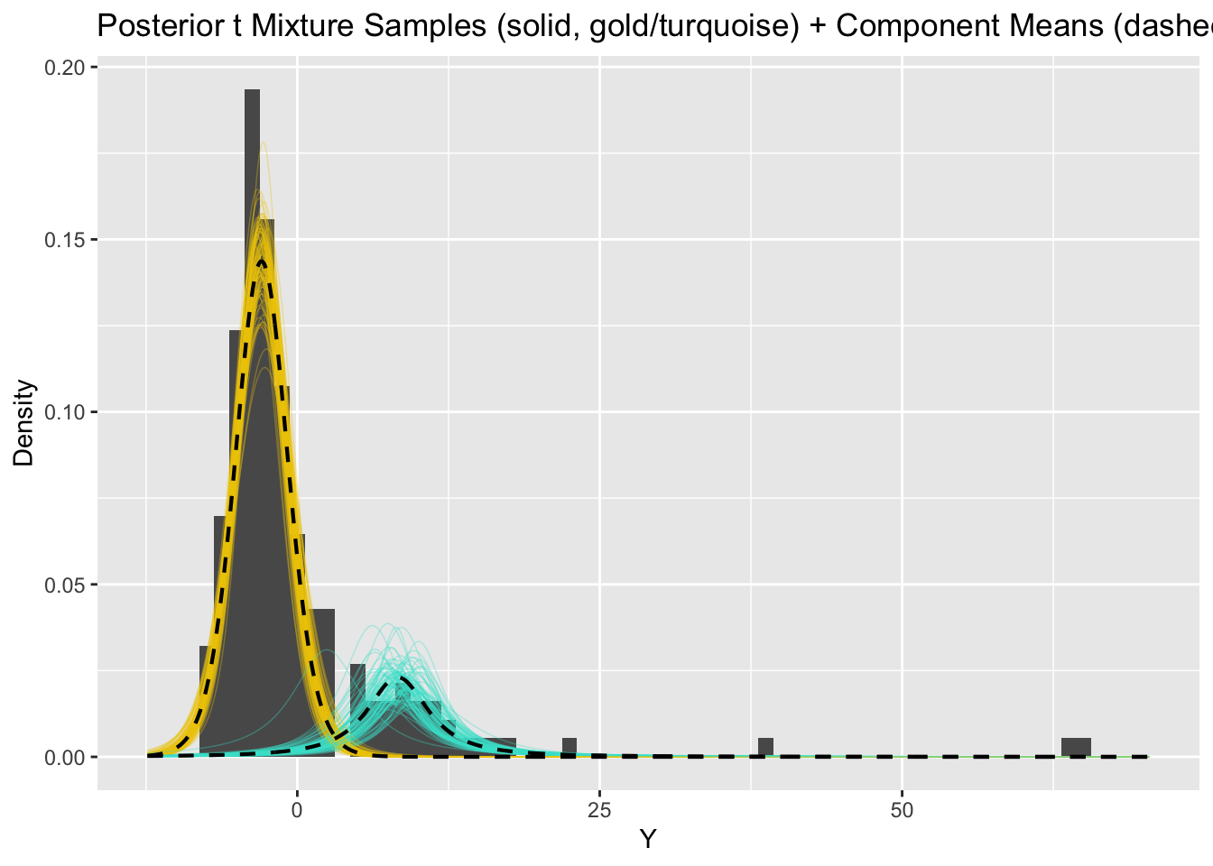 This is a bit tricky because the posterior probability that large \(Y\) comes from the small component is numerically zero.