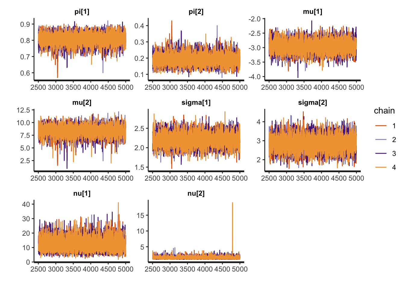 print(fit_mixture_k2t, pars = c("pi", "mu", "sigma", "nu"))Inference for Stan model: anon_model.
