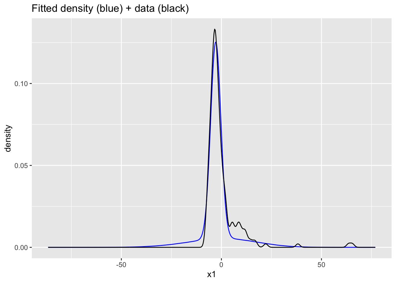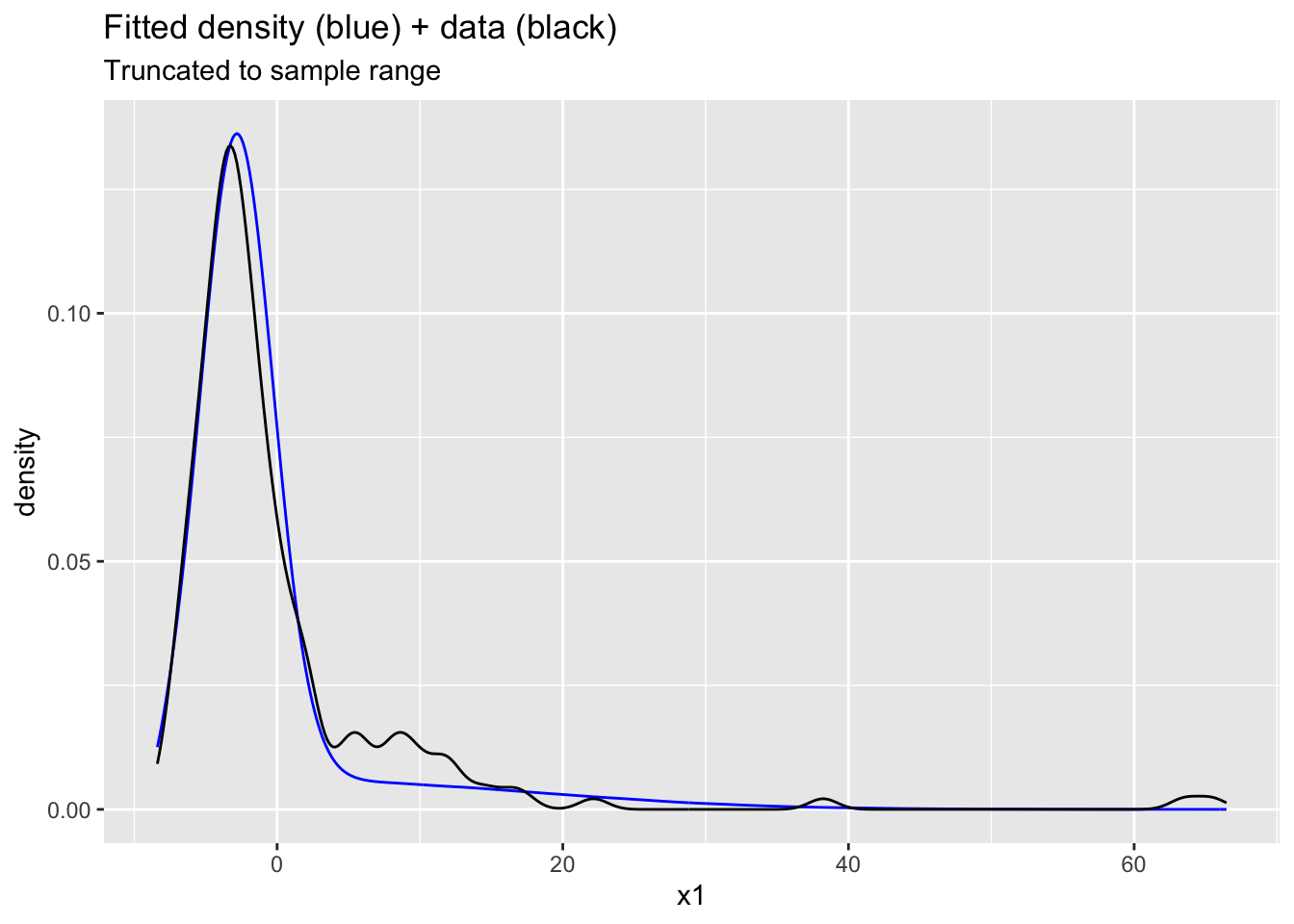 ggtitle("Fitted density (blue) + data (black)", subtitle = "Truncated to sample range")Warning: Removed 29799 rows containing non-finite outside the scale range