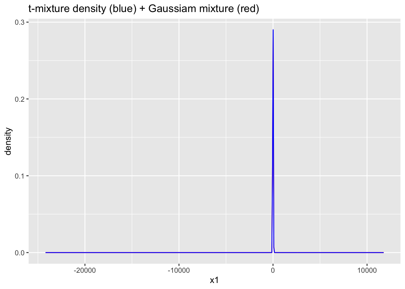 ggtitle("t-mixture density (blue) + Gaussiam mixture (red)")