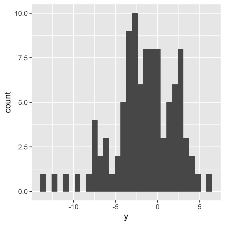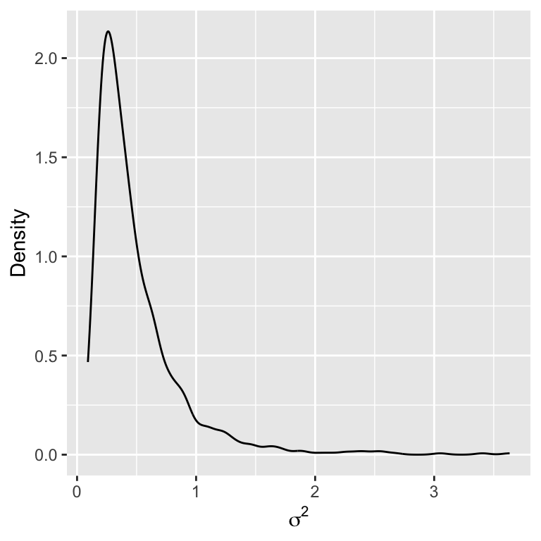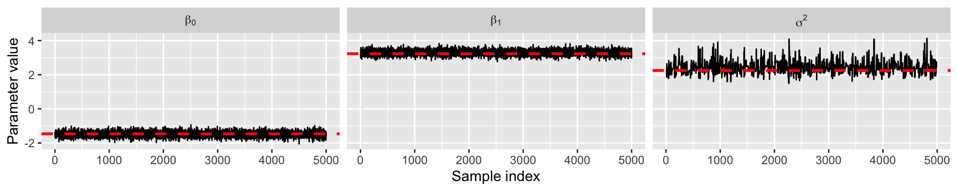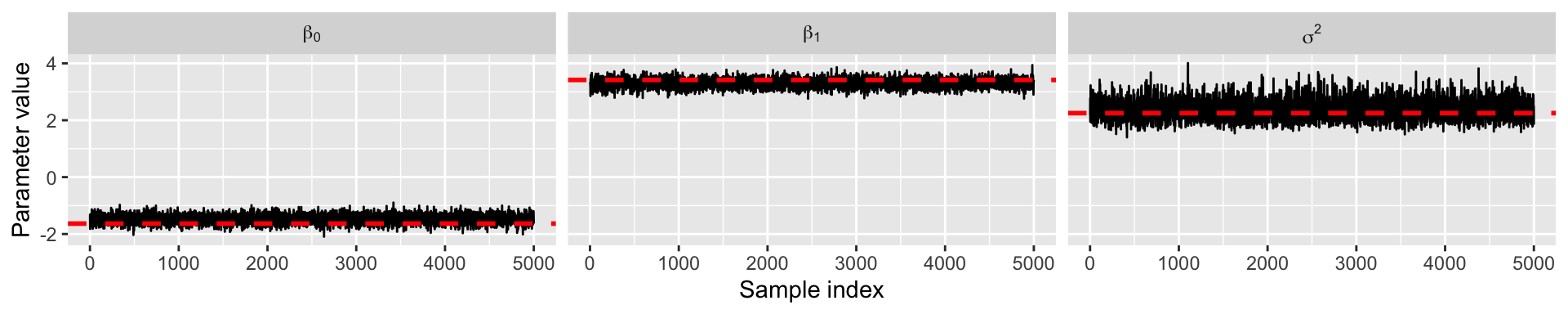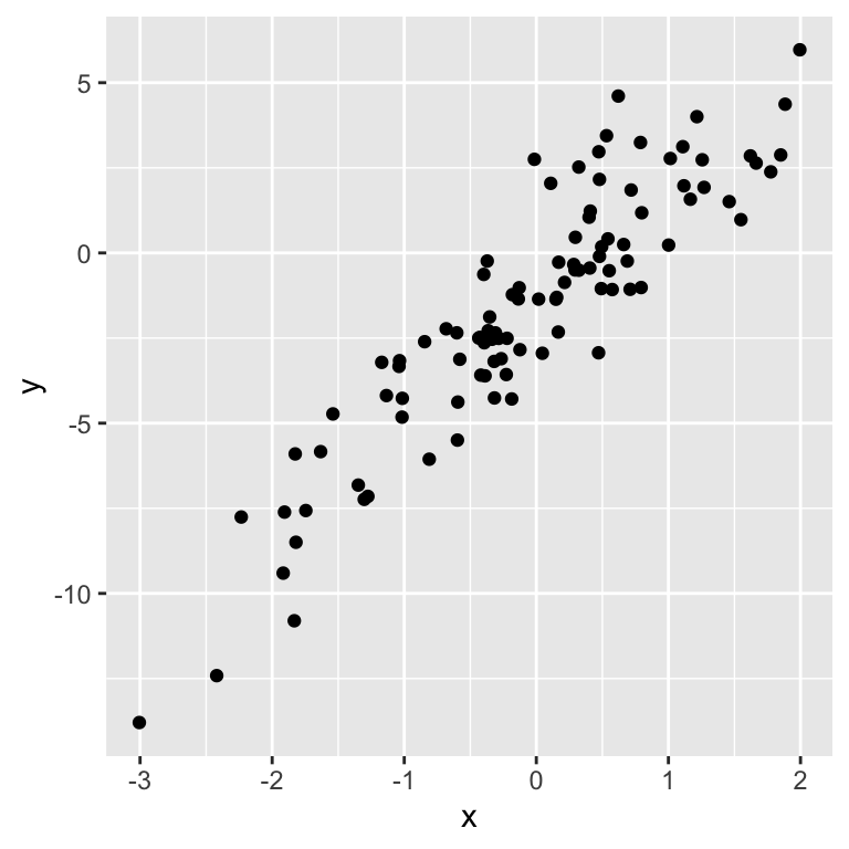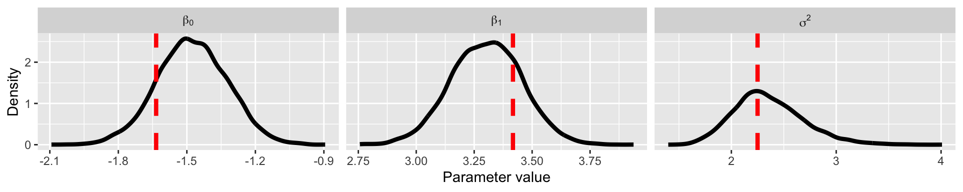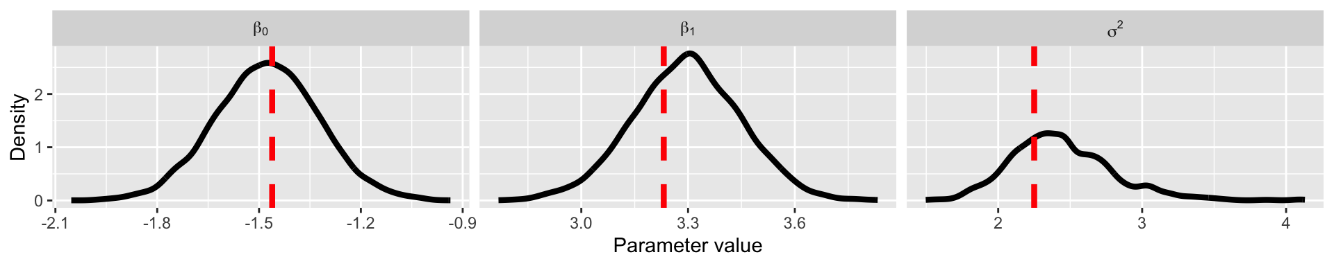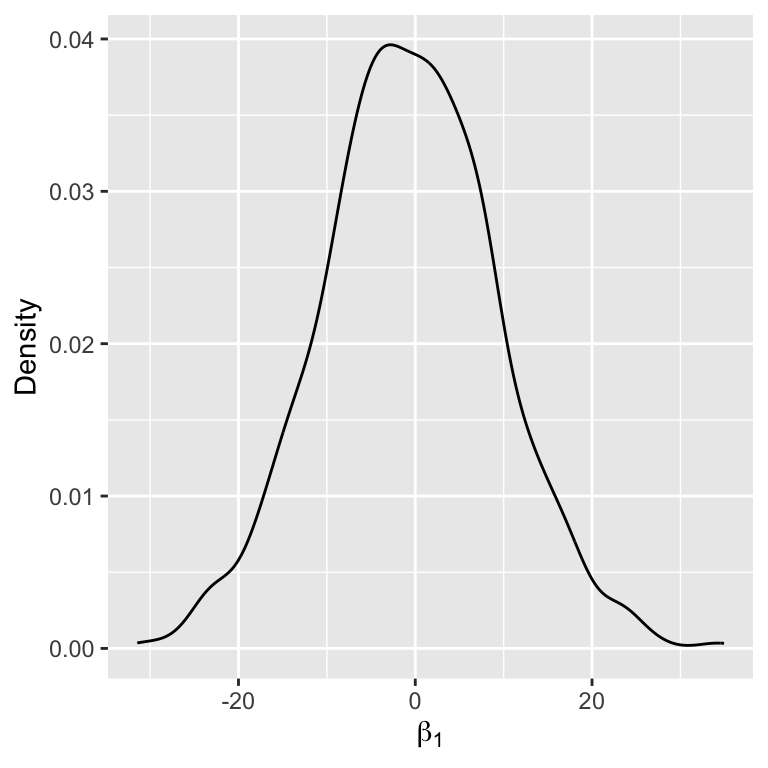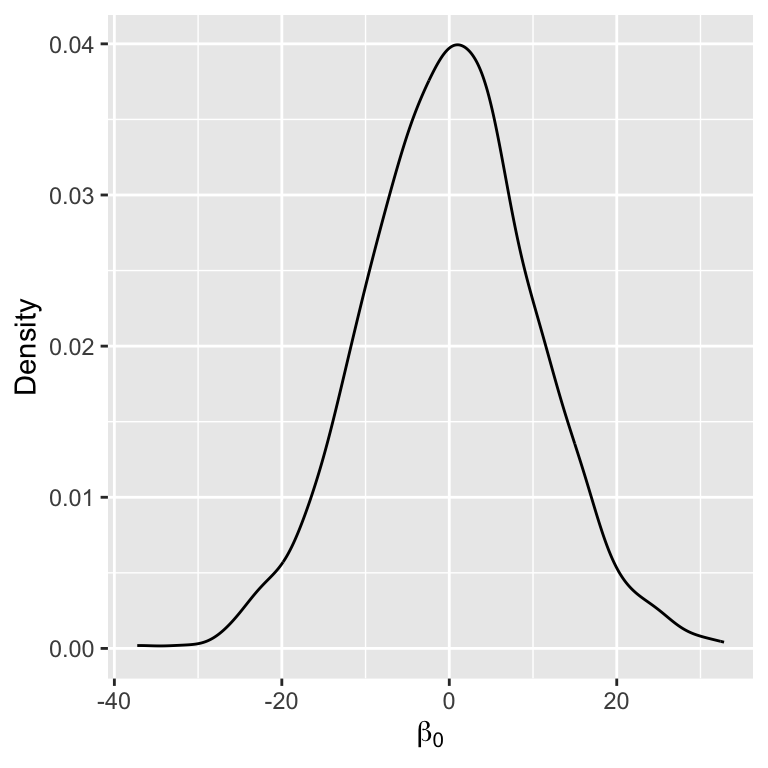 We can also write the likelihood directly, \[\mathbf{Y} | \boldsymbol{\beta},\sigma^2 \sim N(\mathbf{X} \boldsymbol{\beta}, \sigma^2 \mathbf{I}_n),\] where \(\mathbf{X}\) is an \(n \times (p + 1)\) dimensional matrix with row \(\mathbf{x}_i\) and \(\mathbf{I}_n\) is an \(n\)-dimensional identity matrix. Thus, the mean of the observed data is modeled as a linear function of the parameters,