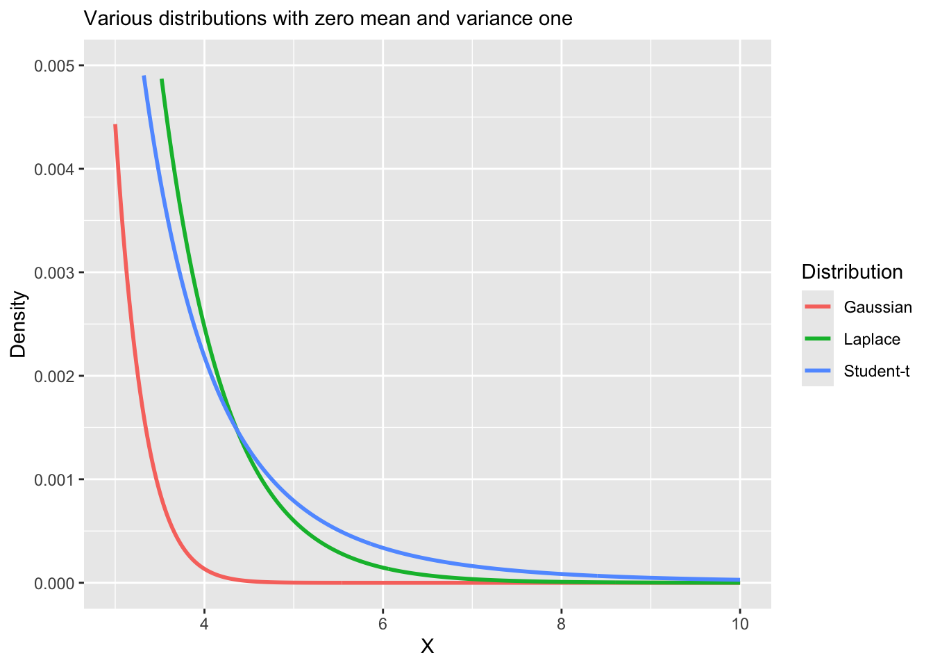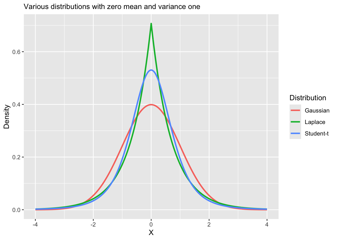 The Laplace distribution is analogous to least absolute deviations because the kernel of the distribution is \(|x−\mu|\), so minimizing the likelihood will also minimize the least absolute distances.
