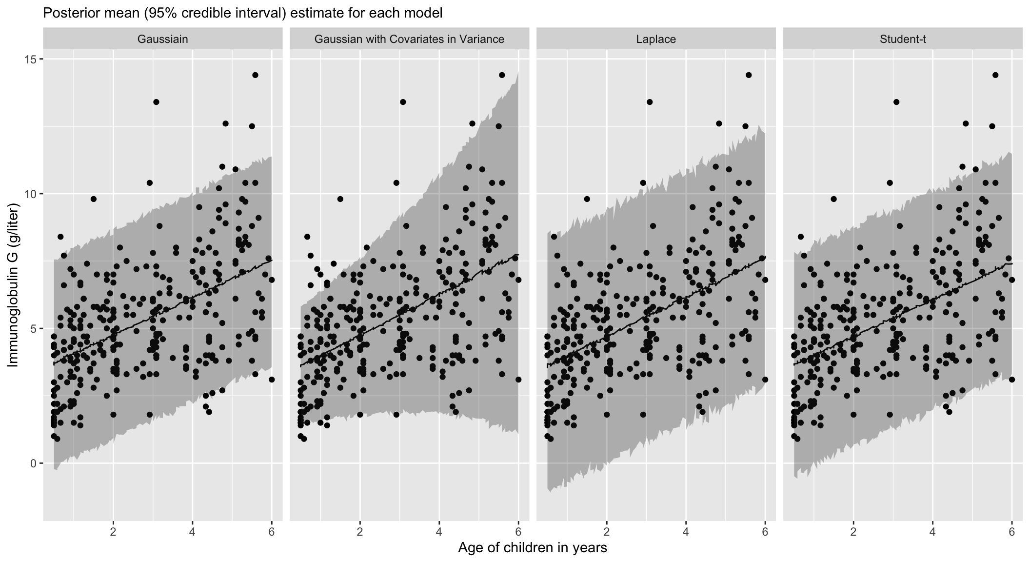 where \(\mathbf{z}_i = (z_{i1},\ldots,z_{ip})\) are a \(p\)-dimensional vector of covariates and \(\boldsymbol{\gamma}\) are parameters that regress the covariates onto the log standard deviation.