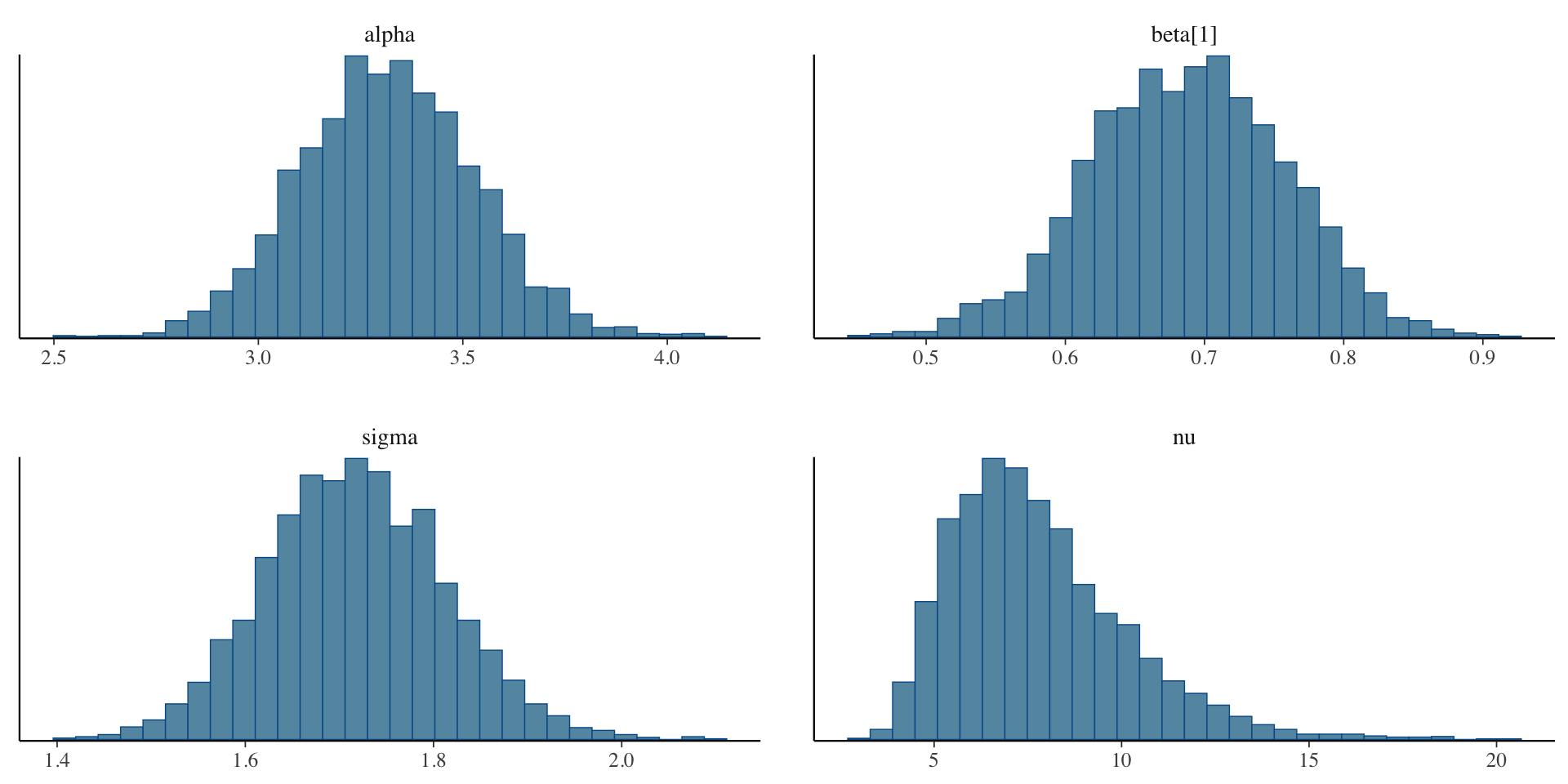 \[Y_i = \alpha + \mathbf{x}_i \boldsymbol{\beta} + \epsilon_i, \quad \epsilon_i \stackrel{iid}{\sim} t_{\nu}\left(0, \sigma\right).\]