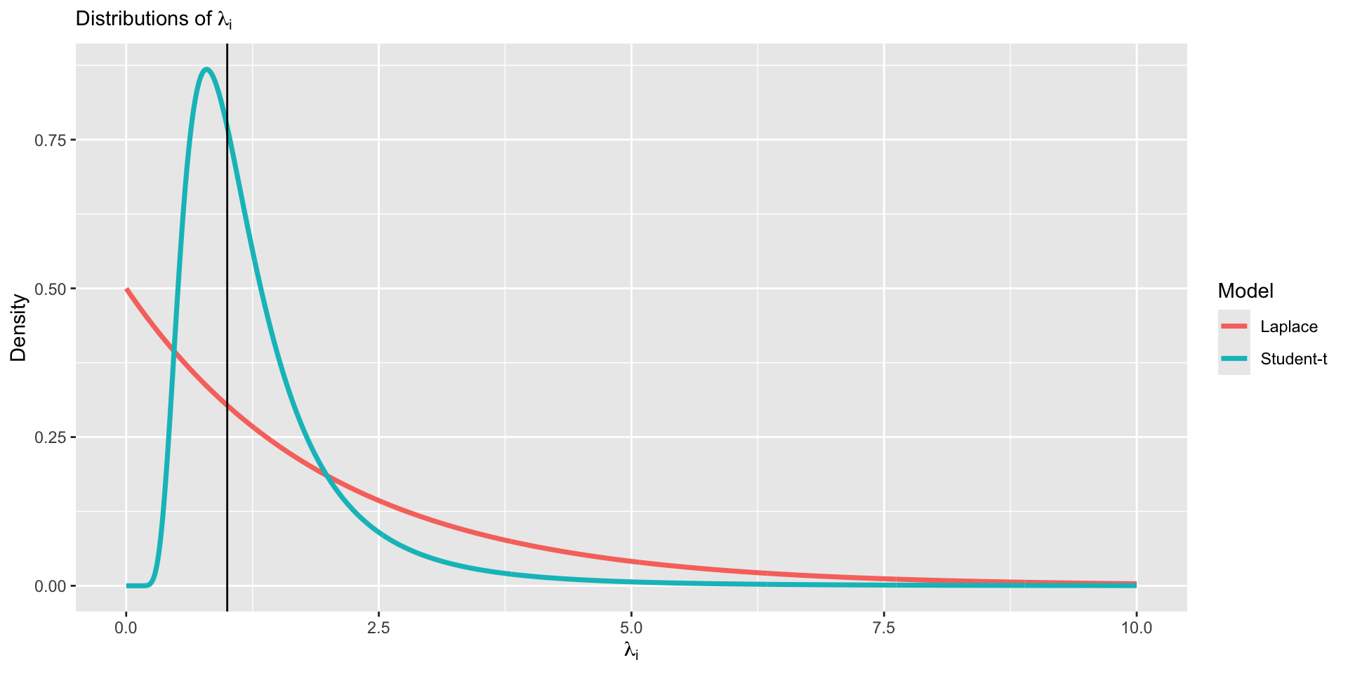 \[\lambda_i \stackrel{iid}{\sim} \text{Inverse-Gamma}\left(\frac{\nu}{2},\frac{\nu}{2}\right).\]