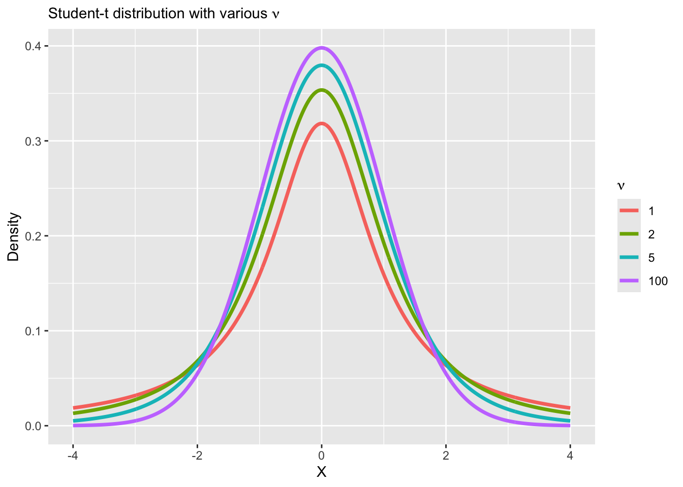A random variable \(T_i \stackrel{iid}{\sim} t_{\nu}\) can be written as a function of Gaussian and \(\chi^2\) random variables, \[\begin{aligned} T_i &= \frac{Z_i}{\sqrt{\frac{W_i}{\nu}}},\quad Z_i \stackrel{iid}{\sim} N(0,1), \quad W_i \stackrel{iid}{\sim}\chi^2_{\nu}\\ &= \frac{Z_i}{\sqrt{\frac{1}{\nu V_i}}},\quad V_i \stackrel{iid}{\sim} \text{Inv-}\chi^2_{\nu},\quad V_i=W_i^{-1}\\ &= \sqrt{\nu V_i} Z_i,\quad \lambda_i = \nu V_i\\ &= \sqrt{\lambda_i} Z_i, \quad \lambda_i \stackrel{iid}{\sim} \text{Inverse-Gamma}\left(\frac{\nu}{2},\frac{\nu}{2}\right). \end{aligned}\]
