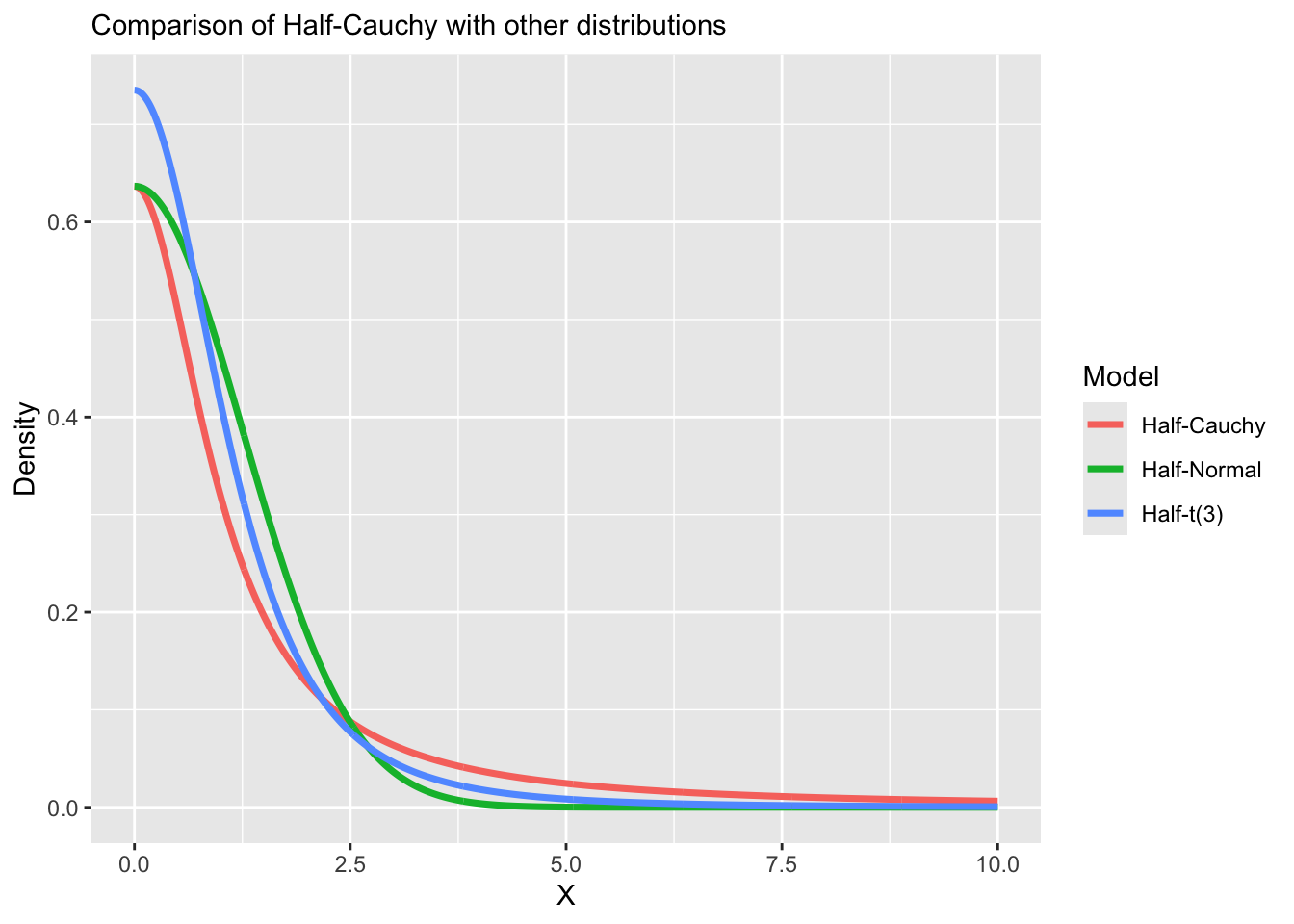 \[\begin{aligned} \beta_j | \lambda_j, \tau &\stackrel{ind}{\sim} N(0, \lambda_j^2 \tau^2)\\ \lambda_j &\stackrel{iid}{\sim} \mathcal C^+(0, 1), \end{aligned}\] where \(\mathcal C^+(0, 1)\) is a half-Cauchy distribution for the local parameter \(\lambda_j\).