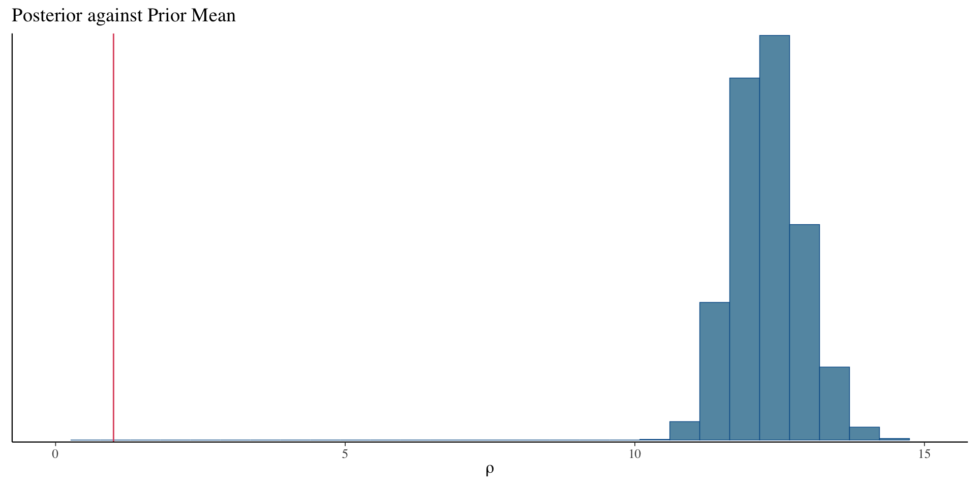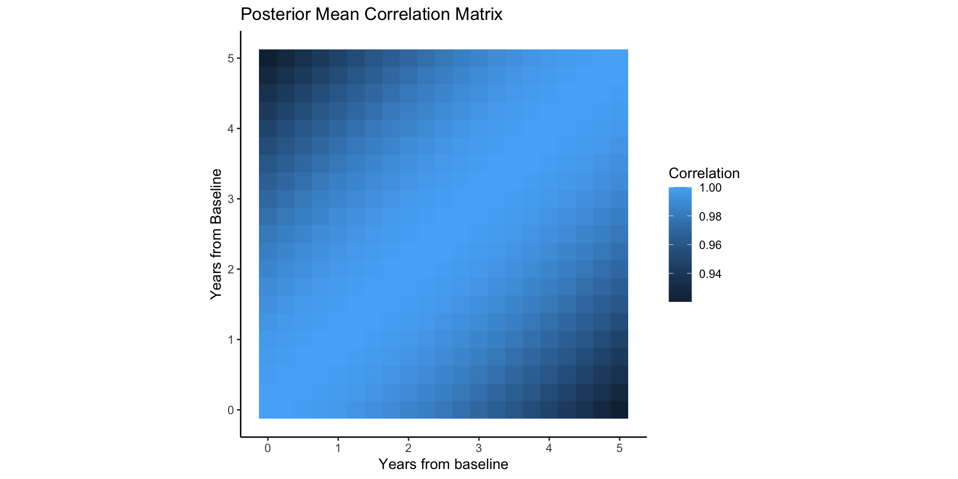 • The posterior mean of \(\rho\) (in year) is very large: the pattern of mean deviation change is very gradual over time.