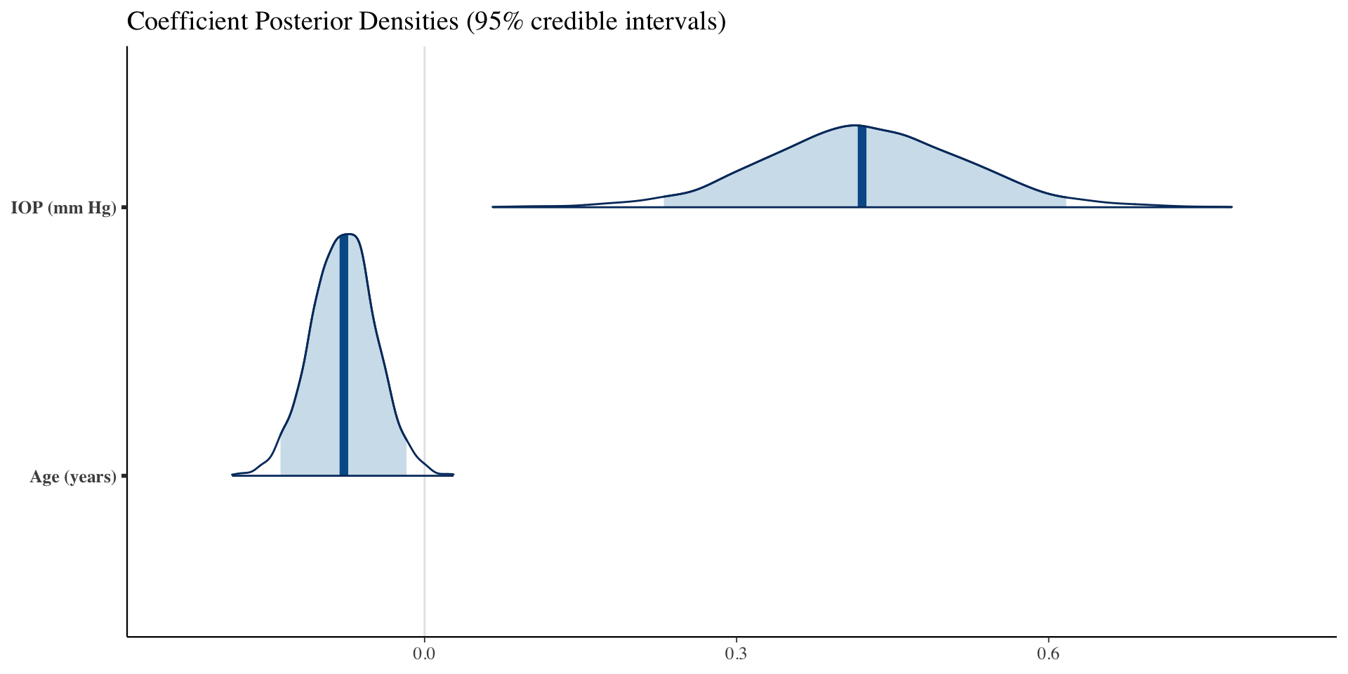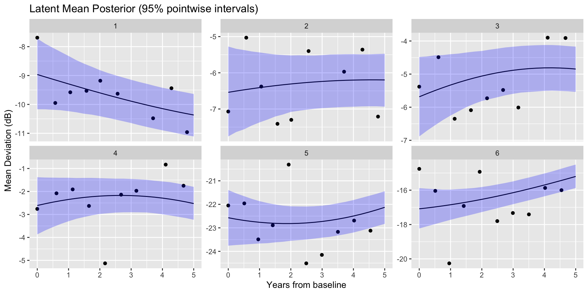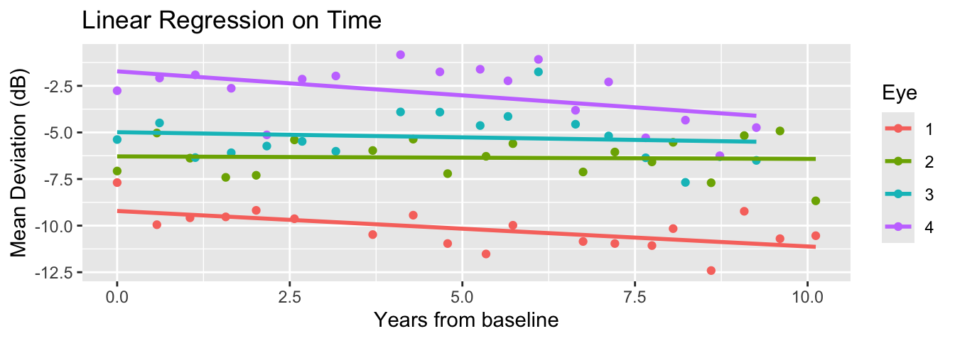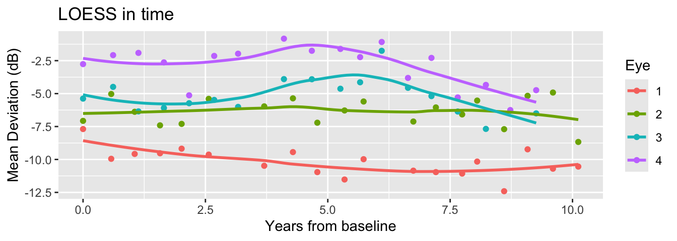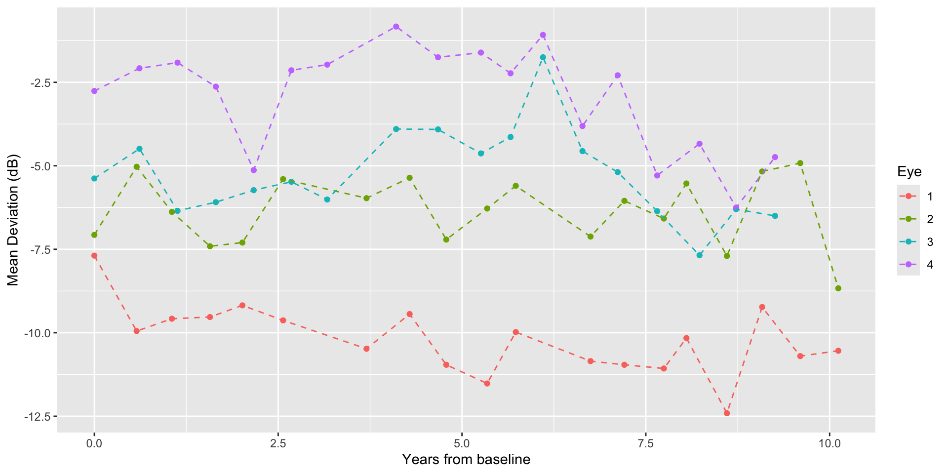 • A posteriori we believe mean deviations of an eye, 10 years apart and adjusted for age and iop, are still strongly correlated (\(e^{-5/6}\sim 43\%\)).