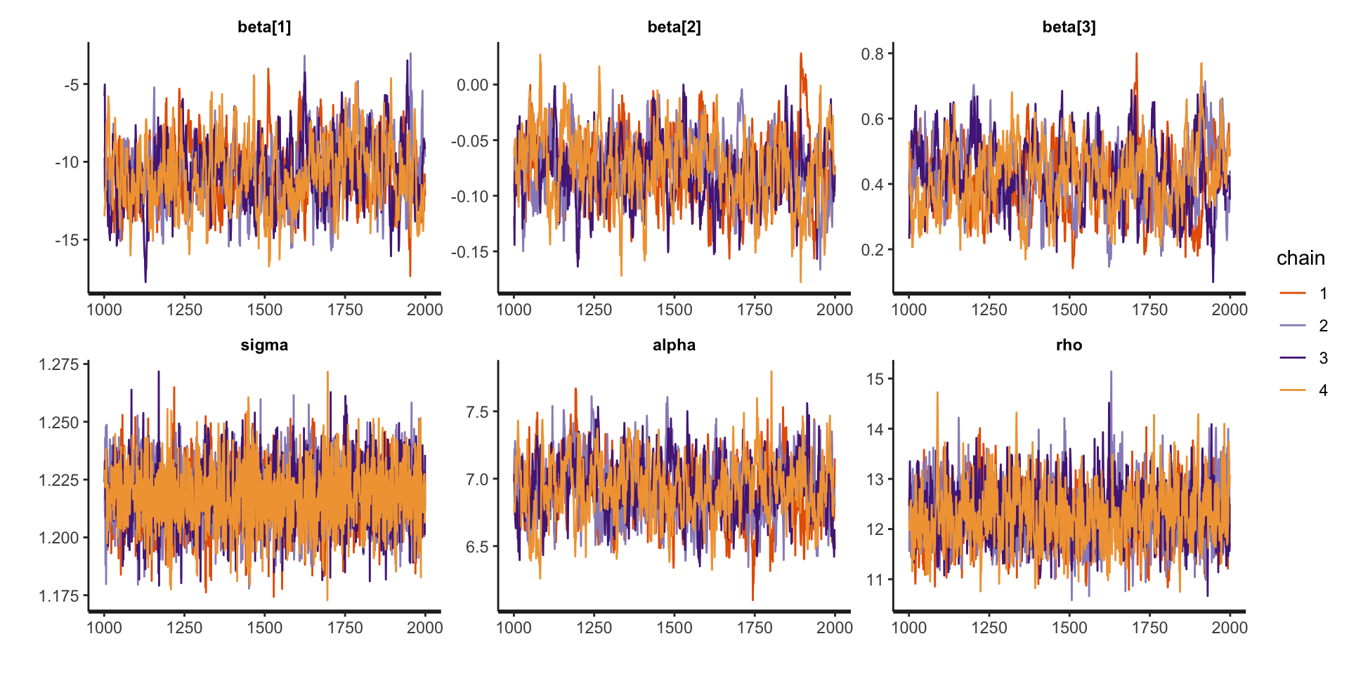 traceplot(gp_marginal_fit, pars = c("beta", "sigma", "alpha", "rho"))