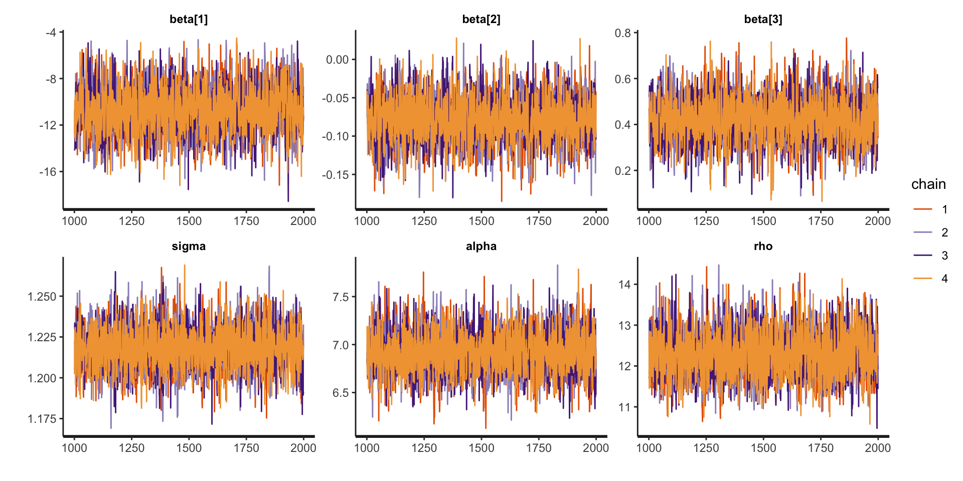 • \(\boldsymbol{\Omega}\) represents the population-level unknown parameters: \((\boldsymbol{\beta},\sigma^2,\alpha,\rho)\).